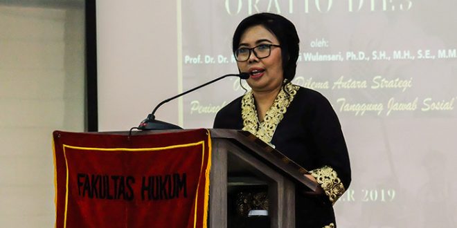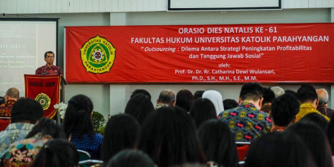 Puncak perayaan Dies ditandai dengan orasi ilmiah yang dibawakan oleh Prof. Dr. Dr. Rr. Catharina Dewi Wulansari, Ph.D., S.H., M.H., S.E., M.M., dengan judul orasi “Outsourcing: Dilema Antara Strategi Peningkatan Profitabilitas dan Tanggung Jawab Sosial.” Pada orasinya, Catharina menuturkan bahwa pemilihan tema ini didasarkan kepada pertimbangan atas semakin berkembangnya praktik Outsourcing di Indonesia. Menurutnya, praktik Outsourcing tersebut dapat mendukung efisiensi dan efektivitas dari suatu perusahaan. Namun di sisi lain, praktik tersebut juga dapat menimbulkan bencana di bidang ketenagakerjaan.